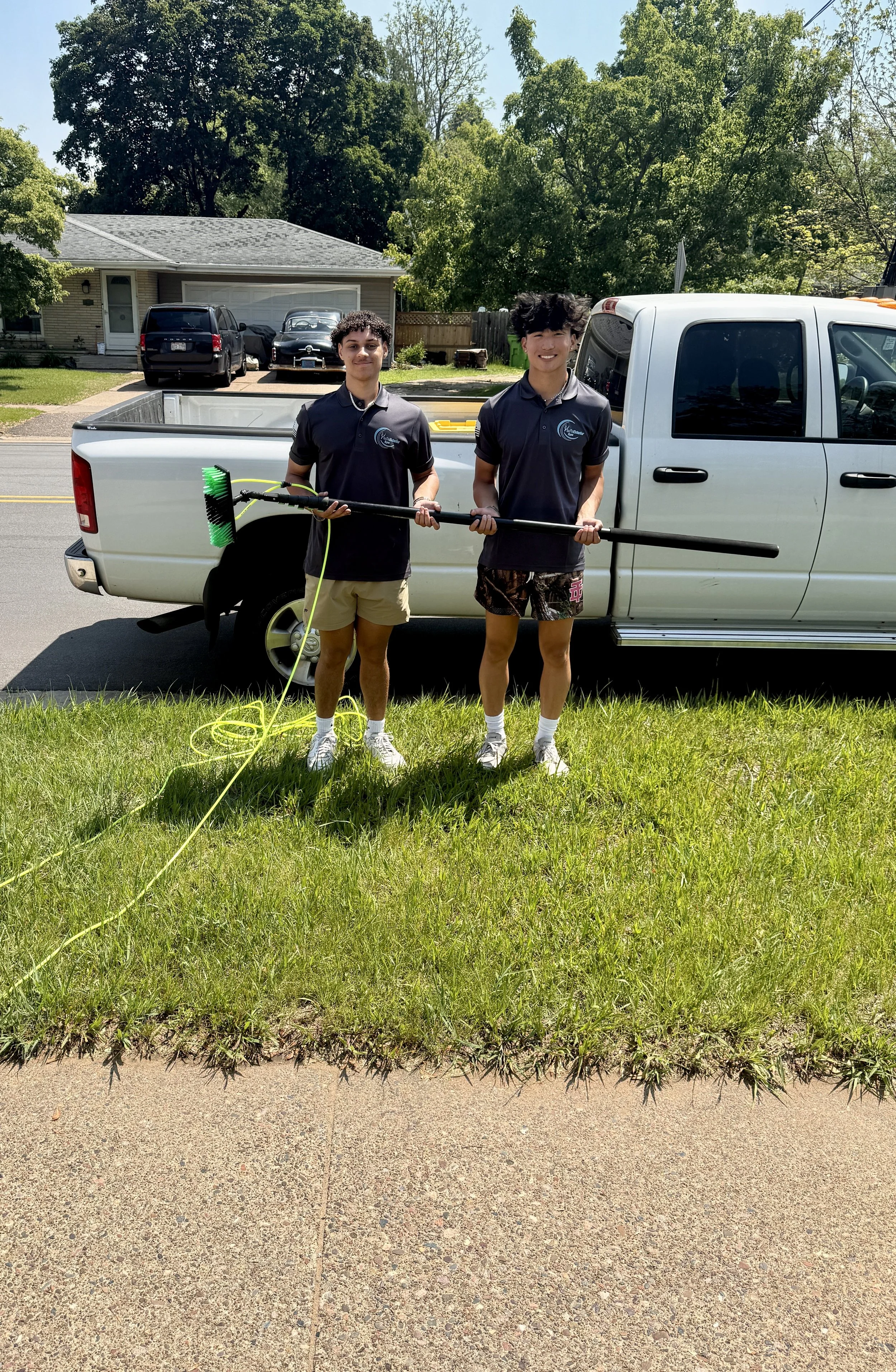 We offer window cleaning using a water-fed pole system with a deionized (DI) water tank. This method uses purified water to clean windows without streaks or spots, reaching high and hard-to-access areas safely and efficiently for a crystal-clear finish.